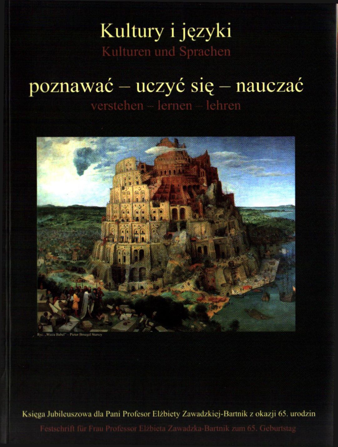 Tyt. grzb.: Kultury i języki, Kulturen und Sprachen. Nazwy aut. na s. 431. U dołu okł.: Księga Jubileuszowa dla Pani Prof. Elżbiety Zawadzkiej-Bartnik z okazji 65. urodzin. Na książce wyłącznie błędny ISBN.