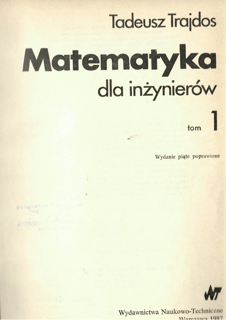 Matematyka dla inżynierów. T. 1 / Tadeusz Trajdos. - Wydanie 5 poprawione. - Warszawa : Wydawnictwa Naukowo-Techniczne, 1987. - 423 strony : ilustracje ; 25 cm.